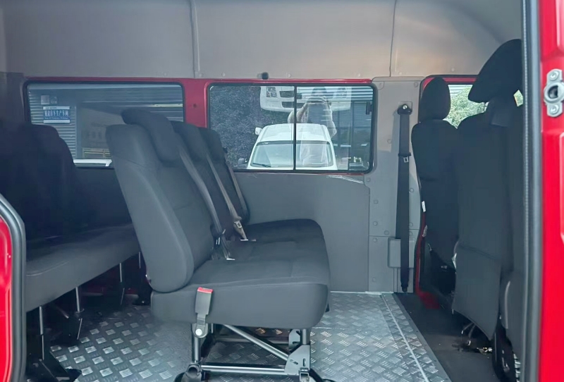‌尺寸‌:整車長5990mm×寬2040mm×高2500mm,軸距3310mm,整備質量約3500-3850kg。載員配置‌:9座布局(含駕駛員),駕駛室3人+乘坐區6人,座椅為人體工程學定制款,配備三點式安全帶及7500大卡空調。安全配置‌:ABS+EBD+ESP、胎壓監測、盲區監測(BSD)、ADAS智能駕駛輔助系統。