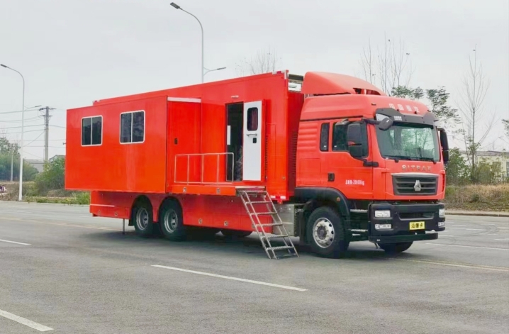 我公司生產的通信指揮車基于汕德卡ZZ5266XXYN504GF1K型廂式運輸底盤改裝,該底盤變速箱為手動變速箱,最高車速89km/h,發動機型號為MC07H.35-60,發動機排量:7360ml,排放國Ⅵ標準。消防通信指揮車以汕德卡ZZ5266XXYN504GF1K型廂式運輸底盤作為改裝平臺,保證工作人員擁有寬敞舒適的工作環境,并且為系統的運行和維護提供符合技術要求的環境條件。在保持整車優良性能的前提下對車輛進行改裝而成,實現符合用戶使用要求的工作環境、使用功能而量身定制的特種專用車輛。消防通信指揮車具備通信組網功能和指揮通信與情報信息采集功能。通過高清晰、低照度車載云臺攝像機,可實現全天候、多方位、大范圍的現場監控功能。通過車載硬盤錄像機,可以對現場的情況進行適時錄像、錄音記錄,以便日后進行調查,并可通過USB接口及數據端口與其他存儲設備相連接,進行現場刻錄,便于錄像資料的及時、有效保存。車載液晶電視可集中顯示系統采集到的信息,便于領導實時掌握事發現場的各種情況,可以及時指揮調度,正確決策。